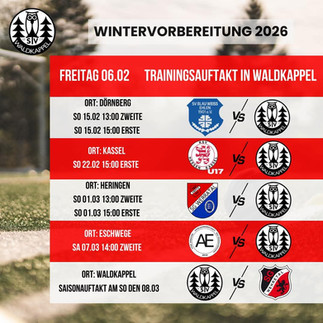 Nach gut zweieinhalb Monaten Winterpause rufen die Trainer Schmidt, Beier und Berg unsere Jungs Anfang Februar wieder auf den Trainingsplatz. Nach individuellen Laufeinheiten zu Jahresbeginn, warten rund vier Wochen Vorbereitung auf unsere Uhlenfänger, bevor die Meisterschaftsserie in das Jahr 2026 startet. Auch an Testspielen mangelt es nicht. So ist das Spiel gegen die U17 des KSV Hessen Kassel sicherlich ein Highlight, aber auch das Wiedersehen mit unserem ehemaligen Trainer Uwe Stückrath bei der SG Werratal erfreut unsere Jungs. Wie gewohnt werden wir von den anstehenden Partien zeitnah berichten.